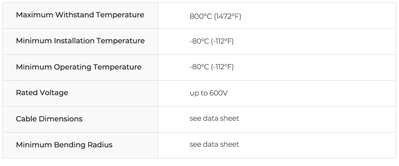 미네랄 절연 케이블은 현존하는 가장 내구성이 뛰어난 전기 열 추적 케이블로 알려져 있습니다. 애플리케이션의 온도 및 전력 출력 요구 사항이 자체 조절 및 일정 와트 케이블의 기능을 초과할 때 이상적인 선택입니다. MI 히팅 케이블은 다음과 같은 요구 사항이 있는 애플리케이션에 사용할 수 있습니다: 단일 및 이중 코어 직렬 난방 저항 케이블, 산화 마그네슘 절연 코어의 길이와 저항이 케이블의 출력을 결정합니다 온도 변화에 영향을 받지 않는 일정한 전력 출력 최대 작동 전압 최대 600V - 더 높은 전압 적용을 원하시면 Heat Trace에 문의해 주세요. 최대 300W/m의 출력 전력 최대 800°C까지 온도 유지 최대 노출 온도 최대 800°C